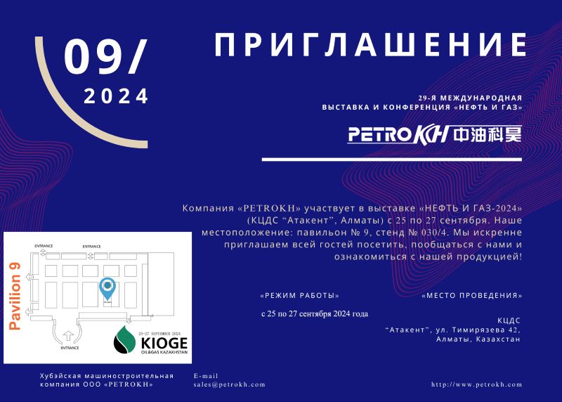 ?PETROKH? принимает участие в выставке ?НЕФТЬ И ГАЗ-2024? (КЦДС ?Атакент?, Алматы) с 25 по 27 сентября. Приглашаем Вас посетить стенд компании (павильон № 9, стенд № 030/4) на международной выставке ?НЕФТЬ И ГАЗ? с 25 по 27 сентября. Мы будем рады увидеть Вас в числе наших гостей, готовы предоставить полную информацию о нашей продукции и обсудить все интересующие вопросы!