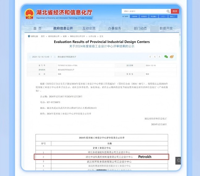 On December 16, 2024, Hubei Provincial Department of Economy and Information Technology announced the "2024 Evaluation Results of Provincial Industrial Design Centers", and our company Hubei Petrokh Machine Manufacturing Co., Ltd was officially recognized as the "Provincial Industrial Design Center 2024".